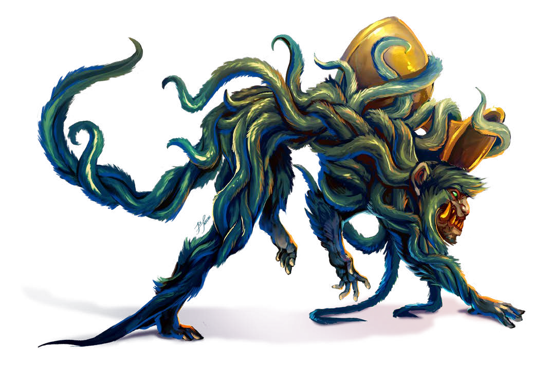 As she enters the doorway chasing the creature she notices a substantial pile of coins and gems in the centre of the vault floor. This pile begins to rise up and swirl around, whirling coins about the room in a metal maelstrom. At this point the others arrive to the fight, Gnangren taking the doorway, Fern standing behind throwing some spells into the fray. Quinn, while trying to aid Fern, steps into the swirling coin storm and is pelted with hundreds of fast moving objects and falls to the floor unconscious. Ebony meanwhile has cornered the monkey creature, which uses the tendrils attached to its back to snatch her dagger from her but is soon run through by rapier and a blast of magic missiles from Fern.